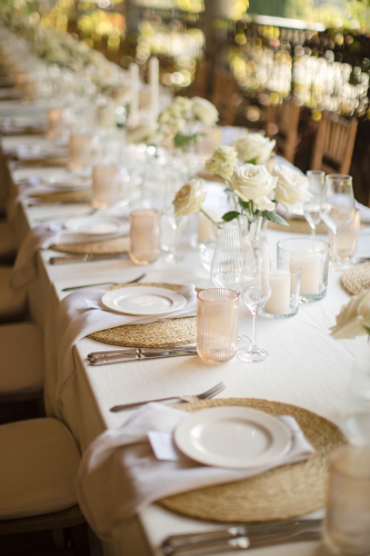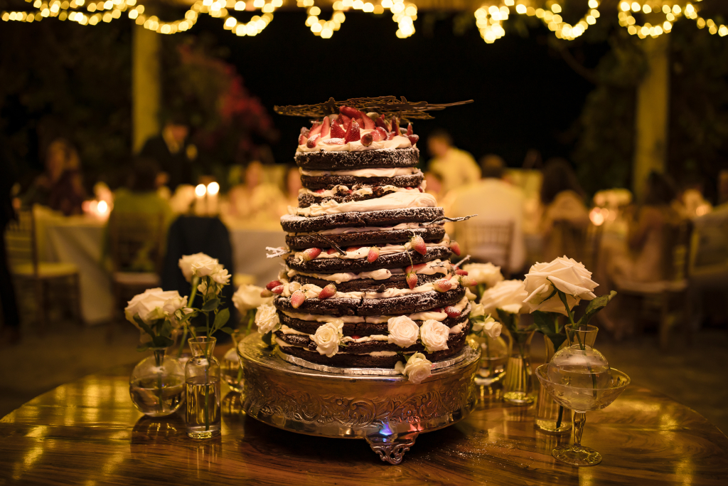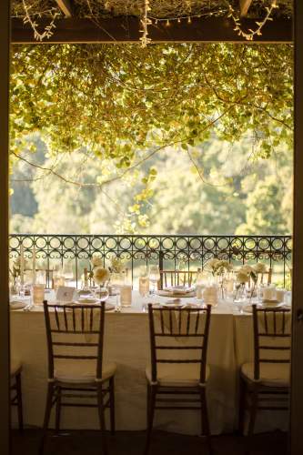 Once the bride and groom had said their ‘I do’s’, the wedding celebrations took place at Kurland’s Villa. Guests chatted and strolled on the lawns, around two seven-metre-long buffet tables on either side of the pool. The tables were adorned with plants and covered in brown paper for an authentically rustic, Italian feeling, setting the stage for al fresco dining at its finest.